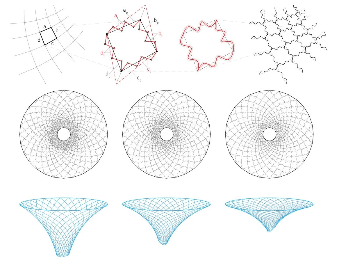 The question of how to achieve tailored, stretched forms was approached through the basic principle that a by introducing a curve instead of a line between two nodal points, a greater working length under loading can be achieved. By setting a target length derived from the loaded mesh form, it would therefore be possible to control the resultant length of every individual mesh edge, making it possible to program a range of naturally stressed three-dimensional forms into the flat pattern.