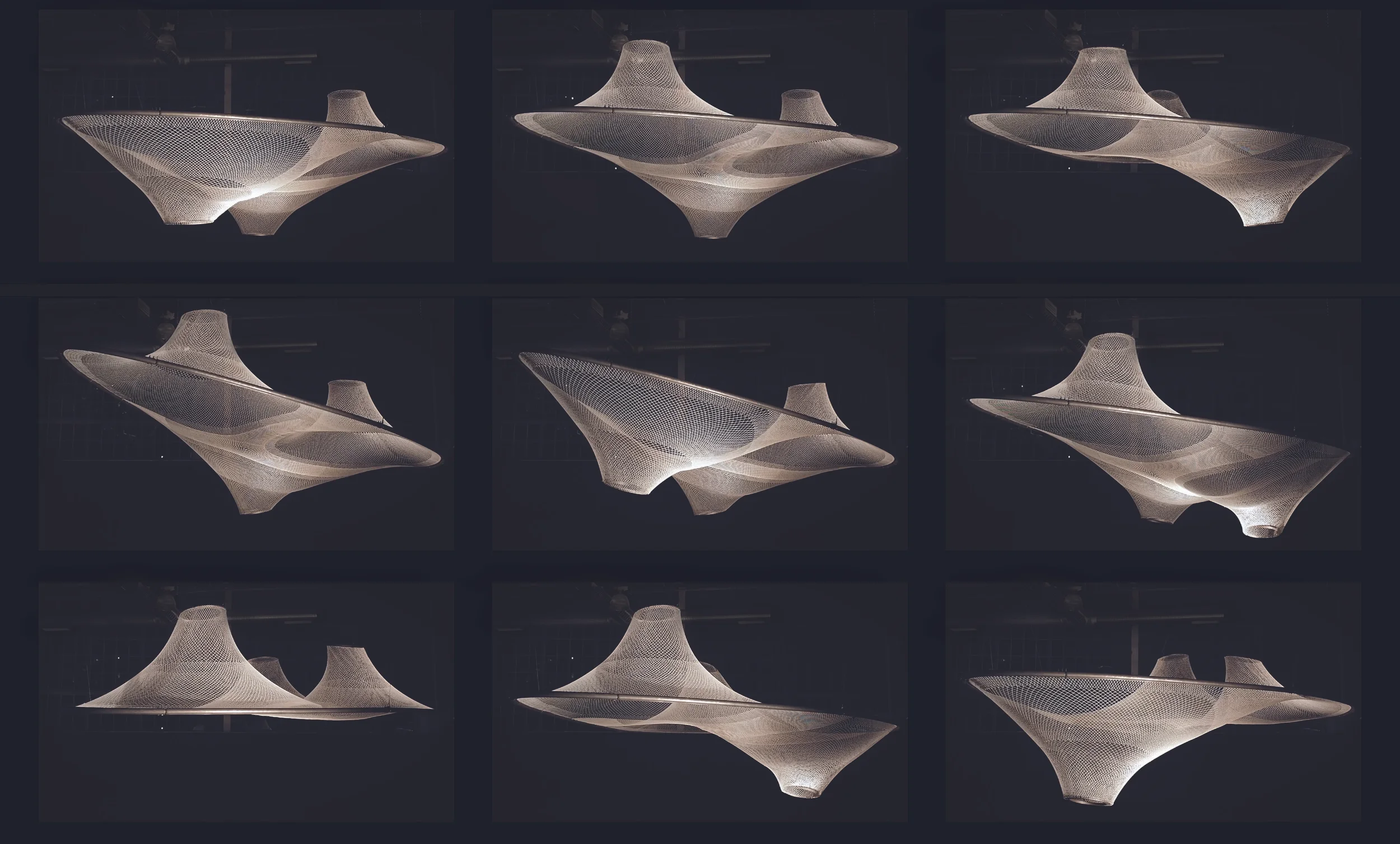 This project explores actuated environments: spaces which can be rapidly reconfigured in real-time, to suit changing programmatic and performative demands, integrated with interactive capacities. The work advances research in cable-based robots for architectural applications, research in computational design environments for kinetic architectures, and research in the production of extruded elastomeric tensile meshes. These research streams are combined to produce a controllable, dynamically reconfigurable spatial enclosure. The project has produced a distributed motion control system that can be utilized to support continuing experimentation with actuation through a range of material and spatial configurations. A physics engine-based design environment has been developed to enable designers to translate kinetic surfaces into working prototypes through an open-source visual programming interface, coupled with an industry- standard software motion controller. A parallel stream of material research has advanced the development of a robotic extrusion printer for thermoplastic elastomers, and the development of “flat to form” geometries that allow two-dimensionally printed mesh-lattices to be tensioned into funicular forms.